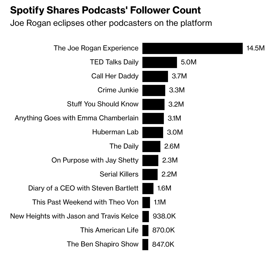 - Spotify has revealed the audience of the top podcasters in the platform [Bloomberg]. Joe Rogan is definitely the most followed podcaster worldwide, with 14.5M subscribers. That means nearly 3x the second podcast, TED Talks Daily. - As I stated in several posts, I believe we are at the beginning of a content revolution that is redefining how audiences consume content (and from whom!).