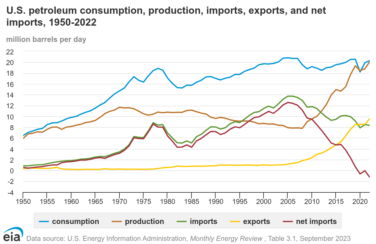 - The US became a total petroleum net exporter in 2020. Several graphs: - The 2.5x production increase since 2008.