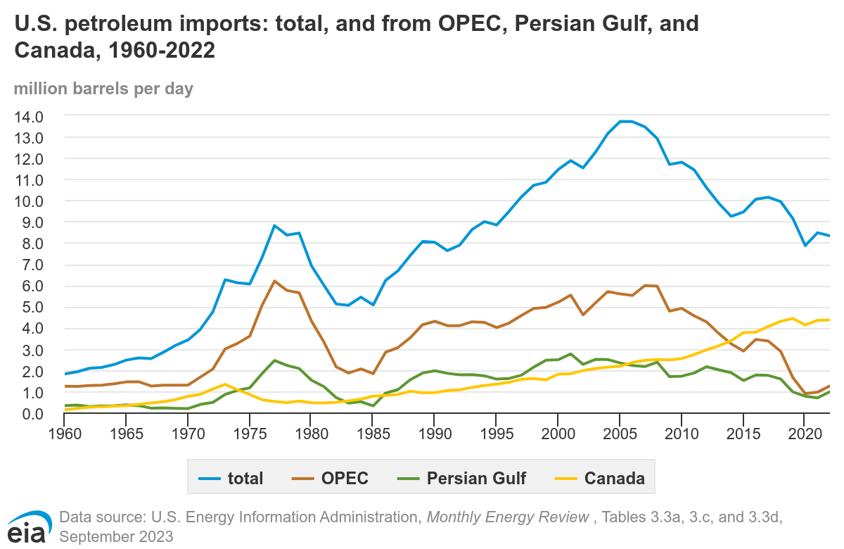 - The evolution of imports by source: - It’s clear that the US is becoming energetically independent, and reduce its dependence from the OPEC and the Persian Gulf. - Credits: Oil and petroleum products explained [U.S. Energy Information Administration]